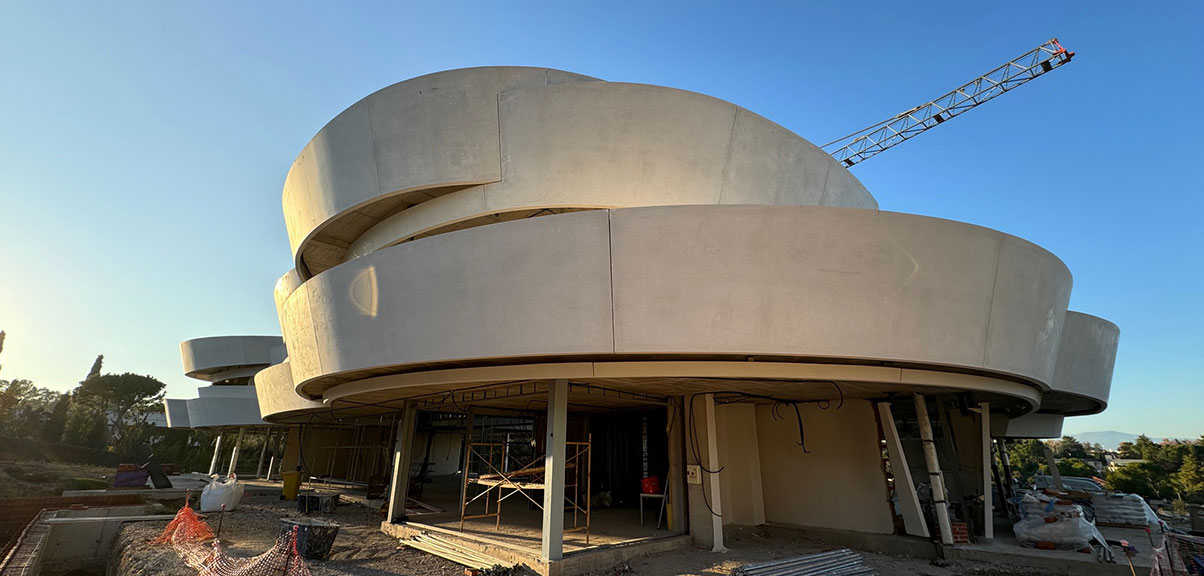 Vivienda unifamiliar con distribución lineal a lo largo de un gran atrio a doble altura que da acceso a todas las estancias permitiendo que todas las principales se encuentren completamente abiertas al espacio exterior, incorporando el jardín y la piscina al interior de la vivienda. Con una geometría curva en la fachada que permite que los espacios fluyan y se conecten entre sí.