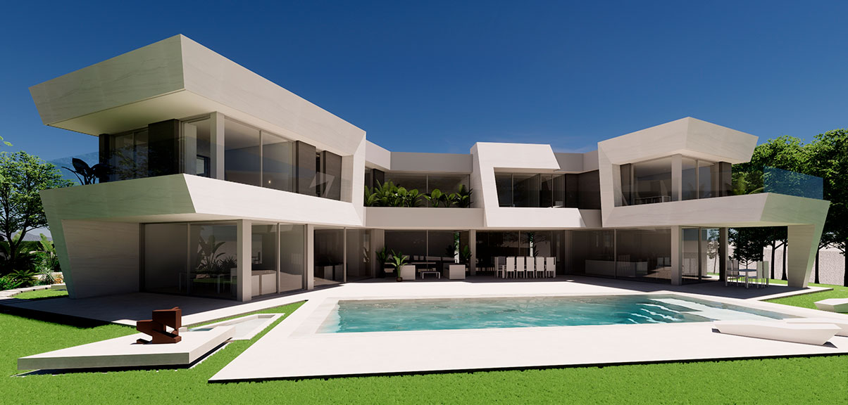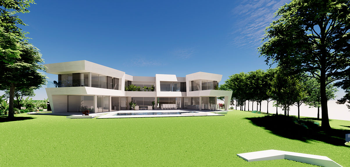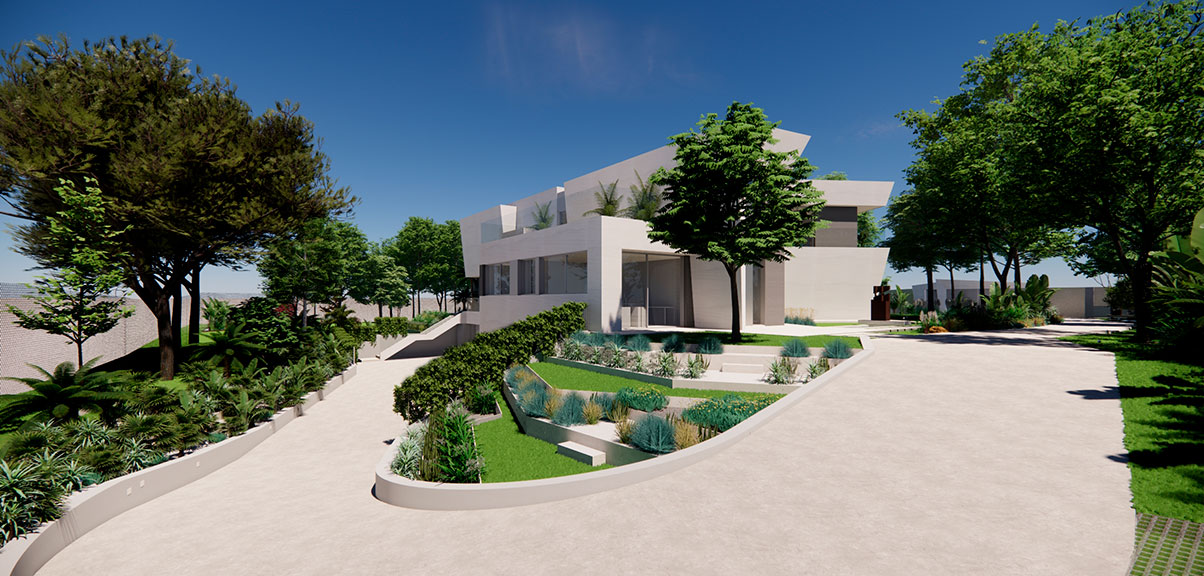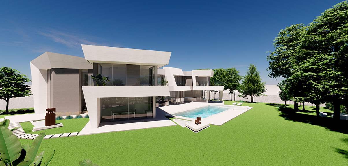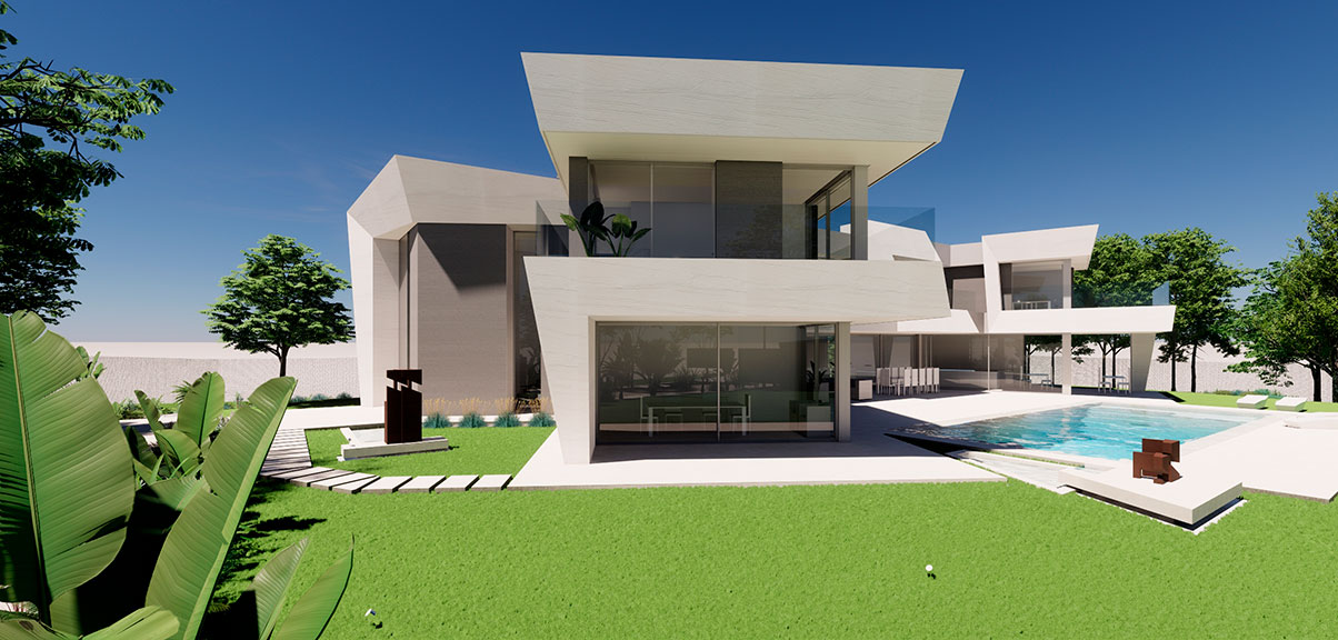 Vivienda unifamiliar de 800 m2 completamente abierta al jardín perimetral, generando una completa fusión del exterior con el interior de la vivienda. La vivienda se organiza en torno a la piscina exterior de manera que tanto desde el salón a doble altura como desde todas las estancias de la vivienda se puede disfrutar de las vistas de la piscina y jardín en todo momento. Las terrazas voladas de planta primera generan los distintos porches de planta baja que se encuentran todos ellos conectados alrededor del espacio central exterior.