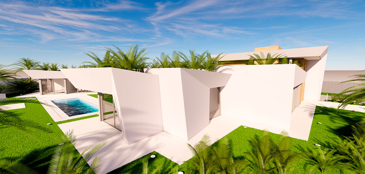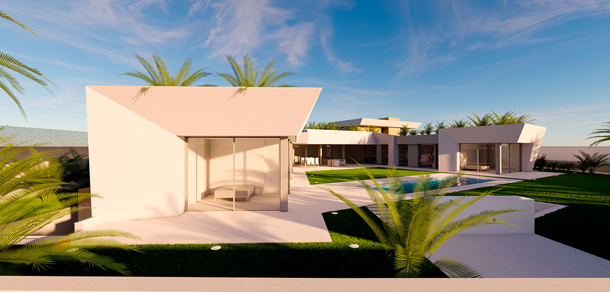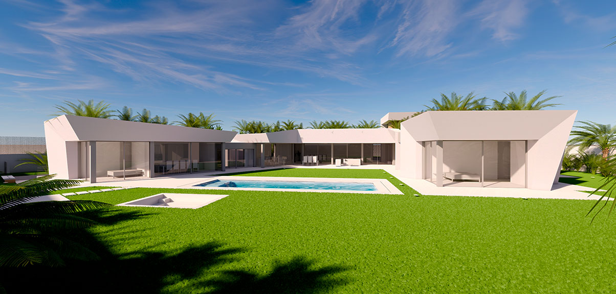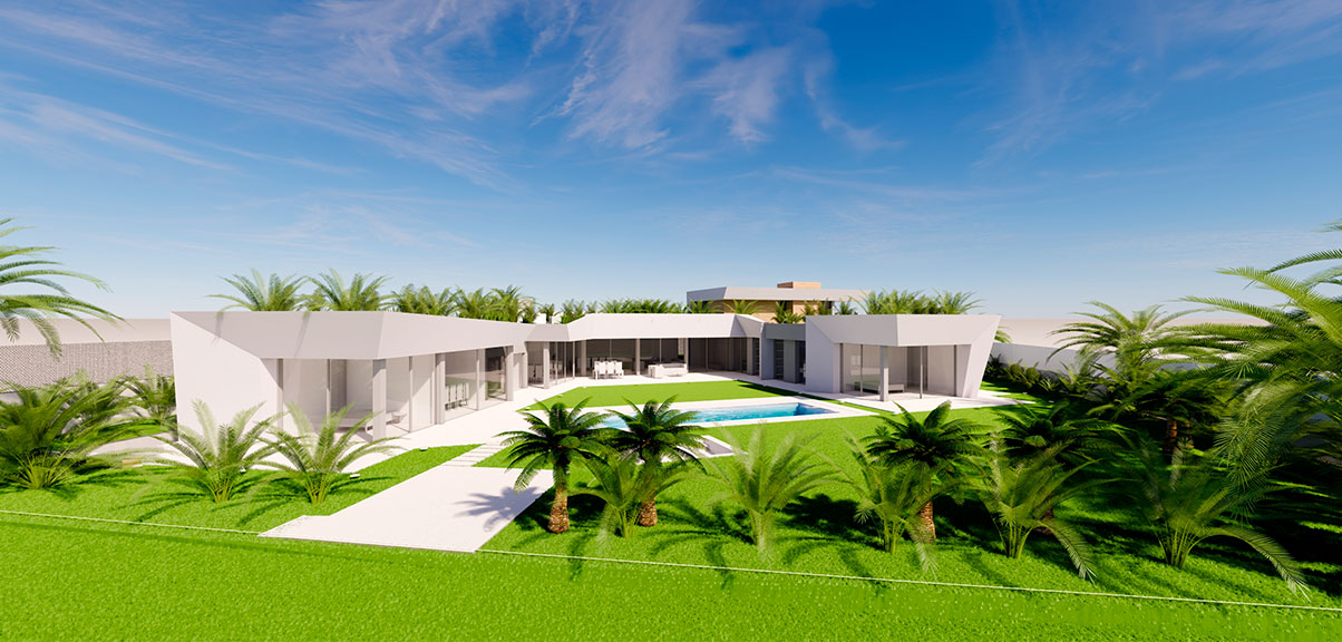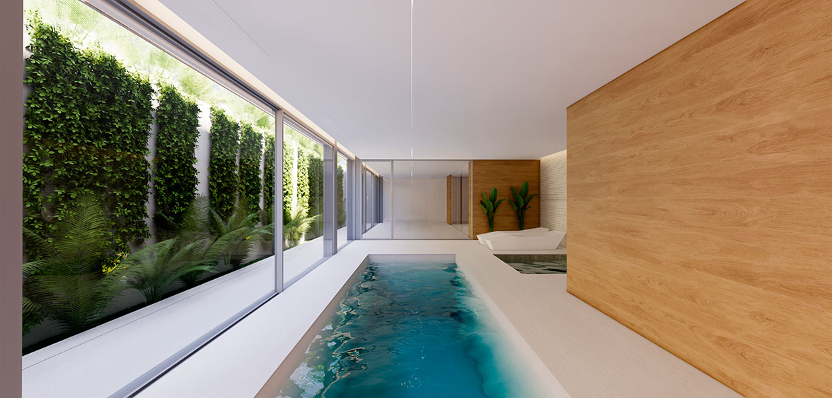 Vivienda unifamiliar de 900 m2 distribuida en planta baja y planta sótano, en forma de U en la que las estancias principales vuelcan sobre la piscina y jardín, permitiendo que el espacio exterior se pueda disfrutar desde todas las estancias de la vivienda. Incluye un volumen destinado a invitados vinculado a la vivienda a través de una galería acristalada, bajo el cual se encuentra la piscina climatizada de planta sótano completamente acristalada al patio perimetral ajardinado de planta sótano.
