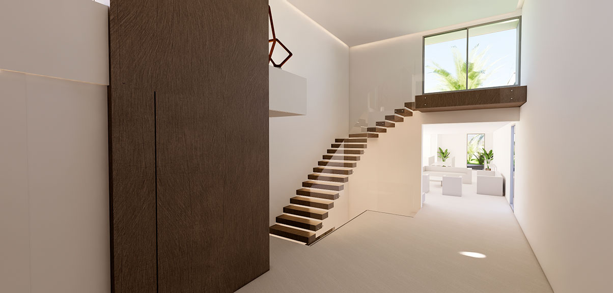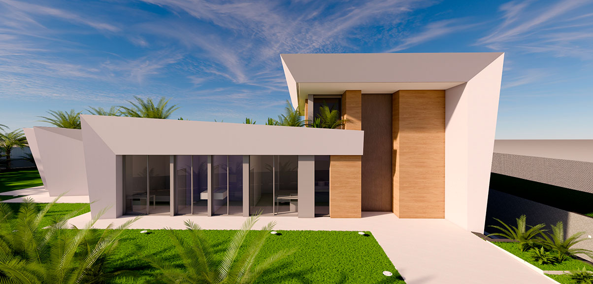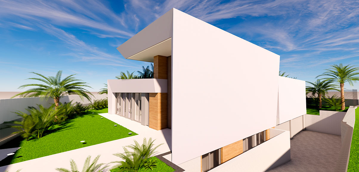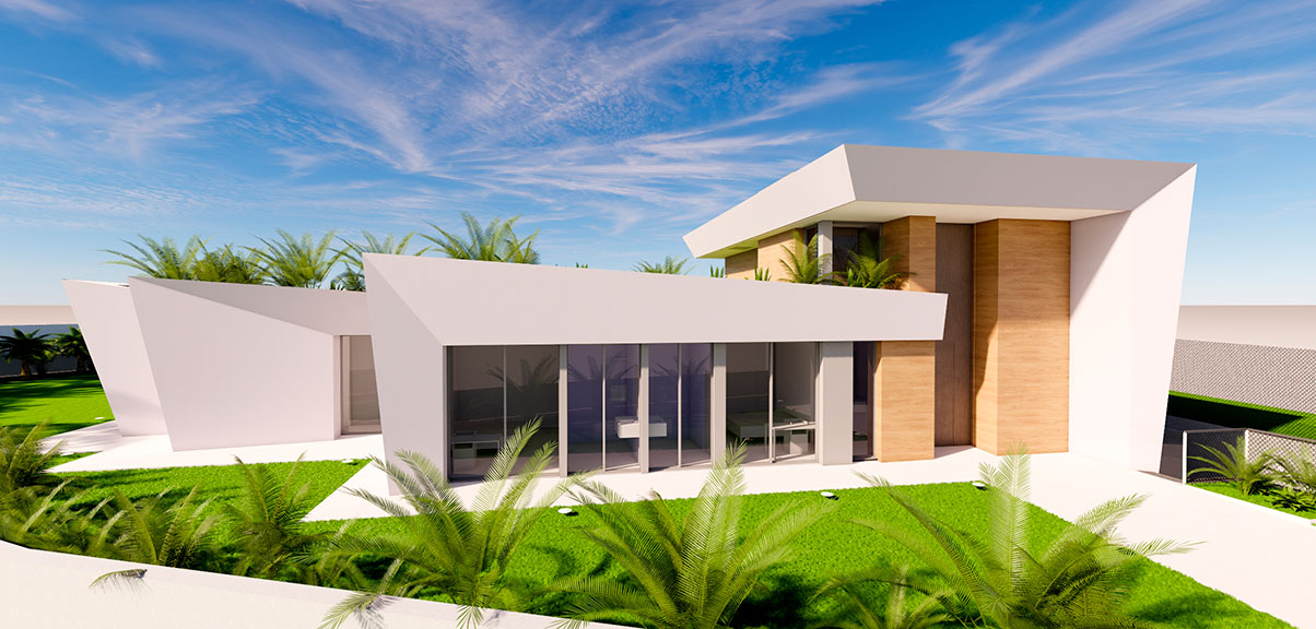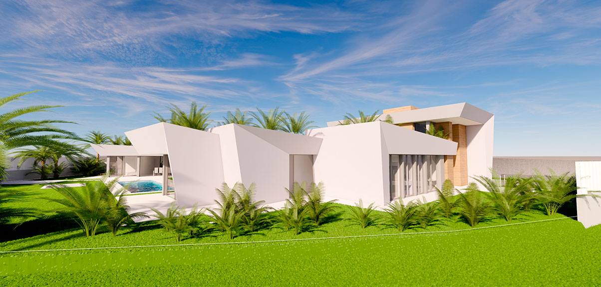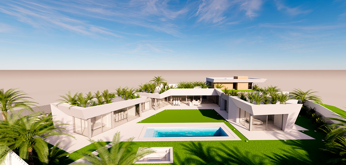 Vivienda unifamiliar de 900 m2 distribuida en planta baja y planta sótano, en forma de U en la que las estancias principales vuelcan sobre la piscina y jardín, permitiendo que el espacio exterior se pueda disfrutar desde todas las estancias de la vivienda. Incluye un volumen destinado a invitados vinculado a la vivienda a través de una galería acristalada, bajo el cual se encuentra la piscina climatizada de planta sótano completamente acristalada al patio perimetral ajardinado de planta sótano.