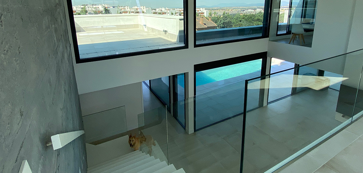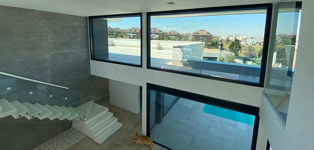 Vivienda unifamiliar de 350 m2, con vistas a la sierra y completamente abierta al jardín y piscina, de manera que el espacio exterior entra en el interior de la vivienda. Con una distribución central en el que el protagonista es el salón a doble altura sobre el que vuelca el despacho de planta primera.